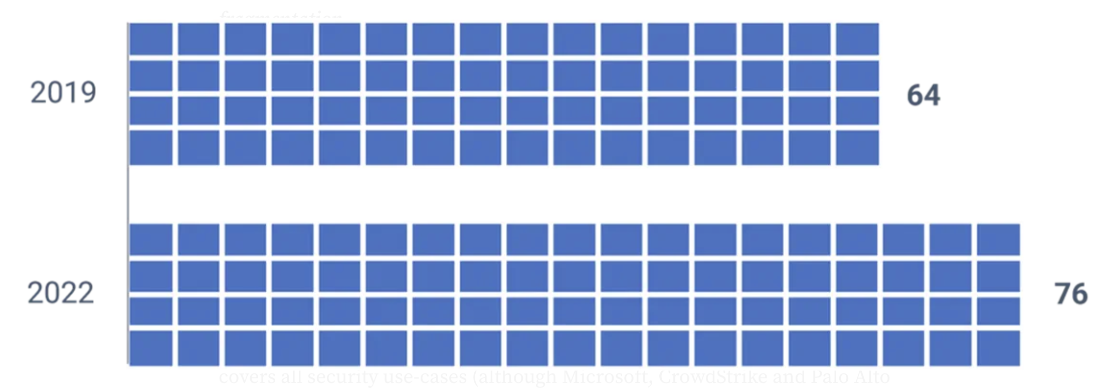 When evaluating the cybersecurity market, and adopting and maintaining relevant tooling, CISOs face yet another challenge: massive fragmentation that drives complexity within business information security technology stacks. In fact, the average enterprise uses more than 75 different security tools (2).